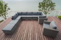 Vier Mittelelemente, drei Eckelemente, ein Sessel sowie zwei Hocker mit Sitzpolster bilden zusammen eine gemütliche Loungegruppe für Ihren Garten oder Terrasse. Die bequeme Polsterung und die hochwertig bezogenen Kissen mit einem wasserabweisenden Bezug aus 100% Olefin (300g/m²) sorgt für den nötigen Komfort und wird Ihnen die Sommerzeit versüßen.