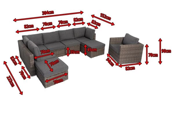 Ihre neuen Gartenmöbel sind äußerst pflegeleicht und strapazierfähig, da die verwendete, halbrunde Faser sowohl Hitze und Frost als auch UV-Strahlen, Salzwasser und Chlor unbeschadet hinnimmt und nichts von ihrer ursprünglichen Schönheit einbüßt. Im Inneren befindet sich ein rostfreies Aluminiumgestell, welches für die nötige Stabilität sorgt und aufgrund des geringen Gewichts einen einfachen Platzwechsel ermöglicht. Alle Module verfügen über edle Aluminiumfüße, die dank der Kunststoffnoppen Ihren Bodenbelag schonen und einen schönen Kontrast zur Polyrattanfaser bilden.