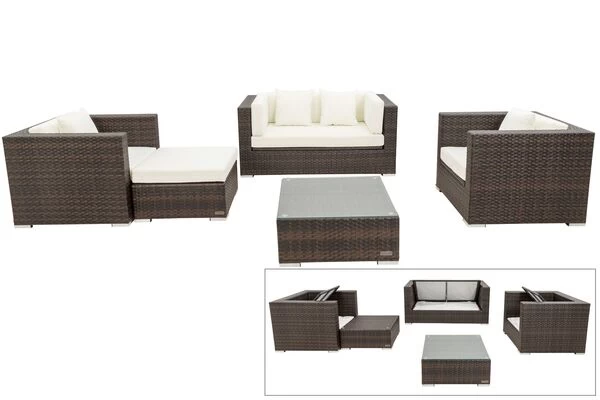 Diese gemütliche Loungegruppe besteht aus 5 Modulen, die Sie beliebig anordnen können. Sie bestimmen somit selbst, wie sich die Möbel auf Ihrer Terrasse am besten präsentieren. Ihre neuen Gartenmöbel sind äußerst pflegeleicht und strapazierfähig, da die verwendete flache Faser sowohl Hitze und Frost als auch UV-Strahlen, Salzwasser und Chlor unbeschadet hinnimmt und nichts von ihrer ursprünglichen Schönheit einbüßt. Im Inneren befindet sich ein rostfreies Aluminiumgestell, welches für die nötige Stabilität sorgt und aufgrund des geringen Gewichts einen einfachen Platzwechsel ermöglicht. Alle Module verfügen über edle Aluminiumfüße, die dank der Kunststoffnoppen Ihren Bodenbelag schonen und einen schönen Kontrast zur Polyrattanfaser bilden.