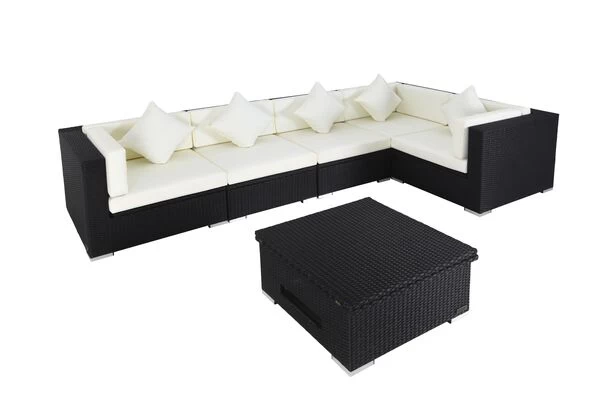Polyrattan-Sitzgruppe mit Kissenboxfunktion inkl. höhenverstellbaren Loungetisch in schwarz für 5 Personen