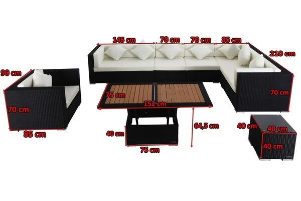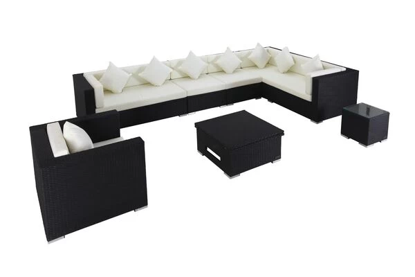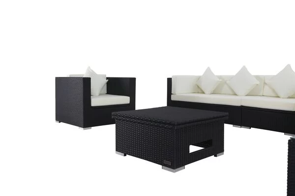 Mit acht Sitzplätzen ist diese Loungegarnitur ein wahres Prachtexemplar und bietet besonders hohen Sitzkomfort dank seiner ca. 10 cm dicken Polstern, welche mit wasserabweisenden Bezügen aus 100% Polyester (300g/m²) geschützt sind. Die verwendete flache und schwarze Polyrattanfaser ist pflegeleicht und sehr wetterfest. Sie trotzt extremen Temperaturen zwischen -60°C bis +70°C genauso wie Chlor, Salzwasser und UV-Strahlen. Im Inneren befindet sich ein rostfreies Aluminiumgestell, welches für die nötige Stabilität sorgt und aufgrund des geringen Gewichts einen einfachen Platzwechsel ermöglicht. So erweist sich diese wertbeständige Polyrattan Gartenlounge als langlebiger Begleiter.
