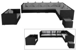 Mit acht Sitzplätzen ist diese Loungegarnitur ein wahres Prachtexemplar und bietet besonders hohen Sitzkomfort dank seiner ca. 10 cm dicken Polstern, welche mit wasserabweisenden Bezügen aus 100% Polyester (300g/m²) geschützt sind. Die verwendete flache und schwarze Polyrattanfaser ist pflegeleicht und sehr wetterfest. Sie trotzt extremen Temperaturen zwischen -60°C bis +70°C genauso wie Chlor, Salzwasser und UV-Strahlen. Im Inneren befindet sich ein rostfreies Aluminiumgestell, welches für die nötige Stabilität sorgt und aufgrund des geringen Gewichts einen einfachen Platzwechsel ermöglicht. So erweist sich diese wertbeständige Polyrattan Gartenlounge als langlebiger Begleiter.