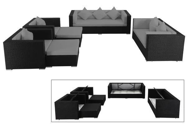Bestehend aus zwei Sesseln, einem 3-Sitzer Sofa, einem 2-Sitzer Sofa und zwei Hocker, lässt sich dieses XXL Gartenmöbel variabel anordnen. Der 1-Sitzer ist mit bis zu ca. 150 kg belastbar, beim 2-Sitzer Sofa sind es ca. 300 kg und beim 3-Sitzer sogar ca. 450 kg. Die Hocker werden jeweils inklusive einer Sicherheitsglasplatte und einem Sitzkissen geliefert. So können Sie ganz einfach aus einem bequemen Hocker einen Kaffeetisch machen, der Gläsern und Geschirr sicheren Stand bietet.