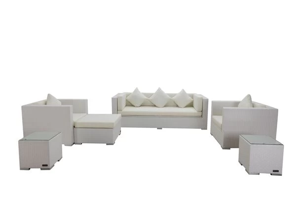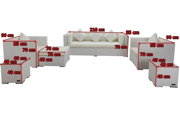 Die Sitzgruppe umfasst ein großes 3-Sitzer-Sofa, zwei Sessel, zwei kleine Beistelltische sowie einen Hocker, den Sie dank der mitgelieferten Glasplatte auch als Tisch nutzen können. Damit ist Ihre Terrasse direkt vollständig ausgestattet. Diese hochwertig verarbeitete und edle Sitzgruppe bietet bis zu sechs Personen einen bequemen Sitzplatz. Hitze und Frost hält die strapazierfähige Polyrattanfaser ebenso stand wie Salzwasser, Chlor und UV-Strahlen. Die Polster der Loungemöbel verfügen über hochwertige Bezüge aus 100% Polyester (300g/m²), die wasserabweisend beschichtet sind und sich angenehm auf der Haut anfühlen.