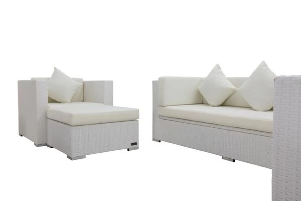 Gestalten Sie Ihre eigene Lounge mit dieser bequemen Sitzgruppe aus weißem, flachen Polyrattan und holen Sie damit ein wunderbares Wellnessfeeling in Ihren Garten.