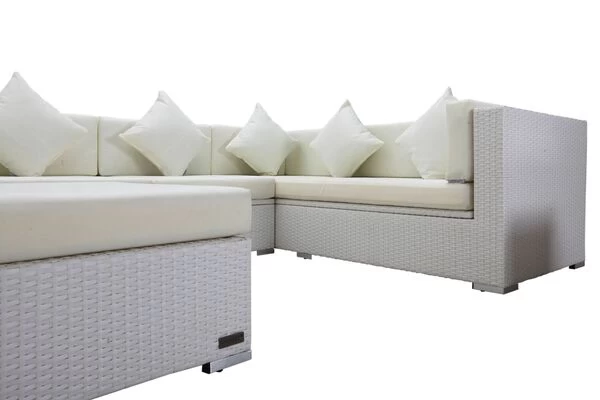 Mit seinem großzügigen Platzangebot ist diese OUTFLEXX® Loungegarnitur ein wahres Prachtexemplar und bietet besonders hohen Sitzkomfort dank seiner ca. 10 cm dicken Polstern, welche mit wasserabweisenden Bezügen aus 100% Polyester (300g/m²) geschützt sind. Die verwendete weiße flache Polyrattanfaser ist pflegeleicht und besonders wetterfest. Sie trotzt nicht nur extremen Temperaturen zwischen -60°C bis +70°C, sondern ist ebenso unempfindlich gegen Chlor, Salzwasser und UV-Strahlen. Im Inneren befindet sich ein rostfreies Aluminiumgestell, welches für die nötige Stabilität sorgt und aufgrund des geringen Gewichts einen einfachen Platzwechsel ermöglicht. So erweist sich diese wertbeständige Polyrattan Gartenlounge als langlebiger Begleiter.
