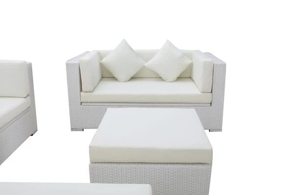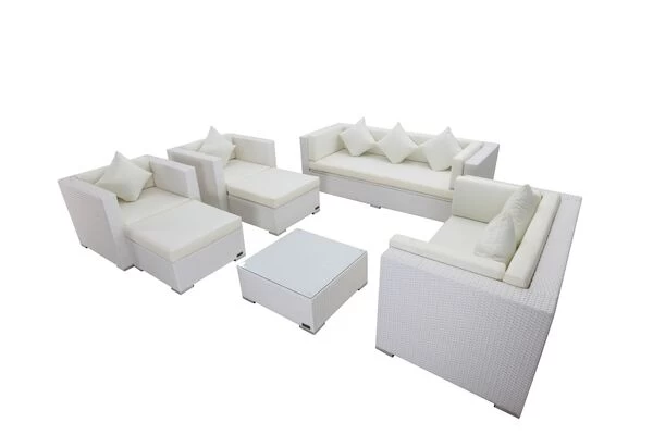 Das Lounge-Set in weiß besteht aus zwei mit Polstern ausgestatteten Polyrattan Sesseln, einem 3-Sitzer Sofa, einem 2-Sitzer Sofa sowie zwei Hockern und einem Kaffeetisch mit je einem Sitzpolster und einer klaren Sicherheitsglasplatte. Dieses Set bietet Ihnen also alles, was Sie für einen schönen Sommer im Garten benötigen und wird garantiert der neue Blickfang in Ihrem Garten oder auf der Terrasse.