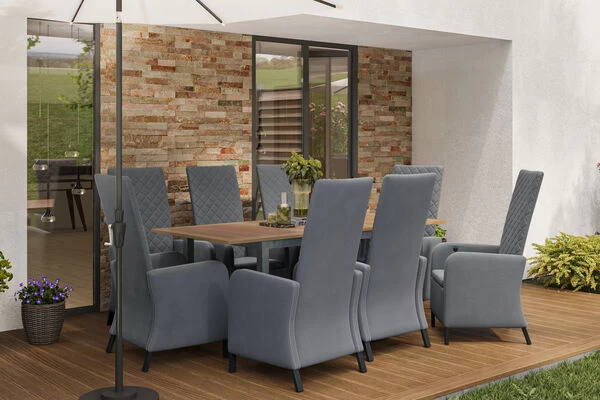 OUTFLEXX® Malaga Sitzgruppe mit Ausziehtisch aus Edelstahl/FSC®-Teakholz und 8 Malaga Sun Sessel aus Aluminium/Sunbrella in der Farbe Flanelle