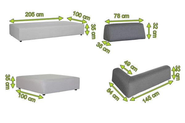 Die gemütliche Loungegruppe besteht aus sechs Einzelteilen (3 Möbelelemente und 3 Rückenlehnen), die Sie beliebig anordnen können: ob als bequemes 3-Sitzer Sofa mit Einsitzer oder als Sitzgruppe mit 7 Sitzmöglichkeiten – Sie bestimmen, wie sich die Möbel auf Ihrer Terrasse am besten präsentieren. Das Obermaterial besteht aus hochwertigem, abriebfesten Agora Textilen (100% Polyacryl). Das Basismaterial ist spinndüsengefärbtes Acryl, bei dem bereits bei der Herstellung Farbpigmente in die Faser eingebettet werden. Der Stoff ist wasserabweisend beschichtet und mit speziellen Quellnähten ausgestattet – dadurch ist das Gewebe UV- und witterungsbeständig. Durch ihre absolute Wetterfestigkeit können Sie Möbel aus Agora ganzjährig ohne Schutz auf Ihrer Terrasse stehen lassen – und auch verschüttete Getränke oder dreckige Schuhe machen dem Stoff nichts aus. Auch in puncto Farbechtheit ist Agora ein Top-Material, die Farbe sieht auch nach Jahren in Gebrauch noch aus wie neu. Außerdem weist der Stoff atmungsaktive, schmutzabweisende und schimmelbeständige Eigenschaften auf, weshalb er sich hervorragend für den Innen- und Außenbereich eignet. Das Innere des Polsters besteht aus besonderem Schaumstoff – dem „Quick Dry Foam“. Dieses Material verfügt über eine offenporige Zellstruktur, welche mit der Funktion einer Drainage vergleichbar ist. Eingedrungenes Wasser kann ungehindert austreten und unangenehme Gerüche sowie Schimmelbildung werden vermieden. Je nach Beanspruchung und Umwelteinflüssen empfehlen wir, die Agora Möbel einmal im Monat mit einem Wasserschlauch oder einer sanften Bürste von oberflächlichen Verschmutzungen zu befreien.