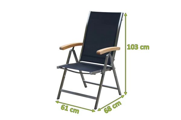 Dieser Multipositionssessel ist nicht nur ein Highlight in Sachen Optik, sondern weiß auch durch seinen Komfort und durch seine qualitative Verarbeitung zu überzeugen. Für ein komfortables Sitzen sorgt die hochwertige textilene Bespannung (75% Polyvinylchlorid und 25% Polyester), die den Multipositionssessel auch ohne Auflagen äußerst bequem macht. Außerdem ist er mittels Rasterschiene 4-fach verstellbar, sodass der Sessel je nach Bedarf in eine Sitz- oder Liegeposition gebracht werden kann. Das zeitlose Design aus einem rostfreien Edelstahlgestell mit einer Textilenbespannung in der Farbe schwarz, macht den Sessel zu einem optischen Highlight für jede Terrasse. Armlehnen aus Teakholz ergänzen das edle Design. Dank der verwendeten Materialien hat dieser Multipositionssessel das sehr geringe Eigengewicht von ca. 9 kg, wodurch er leicht zu handhaben ist und bei Bedarf schnell und einfach zusammengeklappt und platzsparend verstaut werden kann.