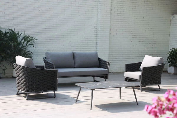 Das Gestell der Sitzgruppe besteht aus pulverbeschichtetem Aluminium in anthrazit und die Sitz- und Rückenfläche ist bespannt mit sehr dickem XL Rope Gewebe ( ca. 3 x 4 cm dick). Dieses im Trend liegende Material ist leicht, robust und stabil. Wenn es regnet oder schneit, sollten Sie diese Lounge allerdings abdecken oder geschützt unter einer Überdachung abstellen. Kein Wunder also, dass viele der hergestellten Gartenmöbel inzwischen mit Aluminium verarbeitet werden. Das hier verwendete Material Rope ist ein modernes Geflecht mit Kordeloptik. Schlicht und auffallend zugleich. Sie dachten, das ginge nicht? Diese Sitzecke beweist das Gegenteil. Strapazierfähig und pflegeleicht ist Rope ebenfalls, so dass Sie nicht viel Arbeit in diese Lounge investieren müssen. Die Tischplatte besteht aus HPL ( High-Pressure Laminat ). Die besondere HPL-Tischplatte besteht aus vielen Schichten Harz und Papier die unter hohem Druck zusammengepresst wurden. Es entsteht eine robuste glatte Oberfläche, die licht- und witterungsbeständig, kratzfest und leicht zu reinigen ist. Außerdem befinden sich im Lieferumfang die grauen Polster für die Sitz- und Rückenfläche, die aus Polyester gefertigt worden sind. Die Bezüge der Polster sind abnehmbar und können auch gewaschen werden, falls diese einmal dreckig werden.