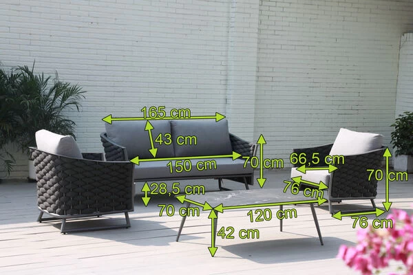 Das Set besteht insgesamt aus 4 Elementen. Zum einen aus einem 2-Sitzer Loungesofa, dann aus 2 einzelnen Sesseln und einem Tisch für die Mitte der Lounge. Der Tisch eignet sich ideal als Ablage für Getränke, Schmöker oder Ihre technischen Begleiter, wie z.B. Tablet oder Laptop. Die 2-Sitzer Couch hat Gesamtmaße con ca. 165 x 76 x 70 Zentimetern. Dank der luxuriösen Größe der gesamten Lounge finden Sie genug Platz für bis zu 4 Personen und haben auch genug Platz um sich mal hinzulegen für ein Nickerchen. Der passende moderne Tisch darf natürlich auch nicht fehlen. Mit einer Größe von ca. 120 x 70 x 42 Zentimetern bietet er genügend Platz. Die beiden einzelnen Stühle haben die Maße von ca. 76 x 76 x 70 Zentimetern. Die hohe Qualität der Materialien sorgt für eine lange Lebensdauer und hohe Funktionalität, wodurch Sie viel Freude an diesem Set haben werden.
