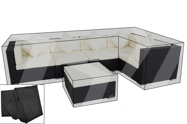 Dieses 2-teilige OUTFLEXX® Premium Abdeckhauben-Set in Schwarz besteht aus 100% Polyester mit einer Stärke von ca. 170g/m². Sie ist mit einer PU-Beschichtung versehen, die sie wasserbeständig und uv-stabil macht. Damit schützen Sie Ihre wertvolle Polyrattan Loungegarnitur zuverlässig vor Staub und Verschmutzung. Die Schutzhülle ist mit einem stabilen Zugband versehen und lässt sich so fest verzurren.