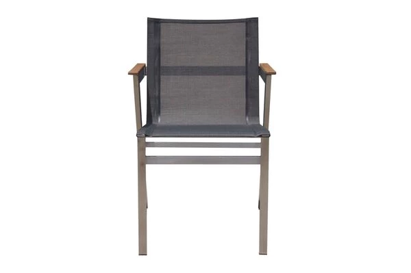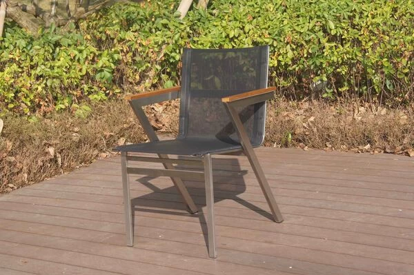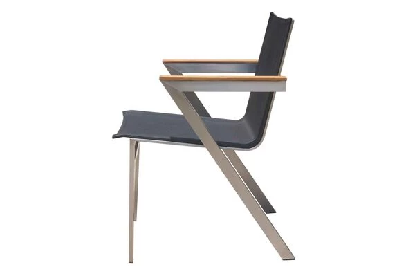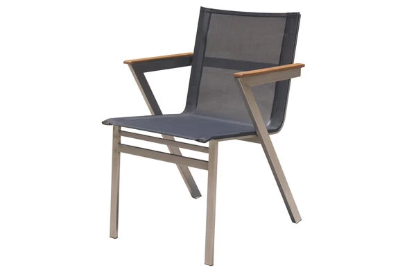 Stapelsessel mit FSC®-zertifizierten Teakholz-Armlehnen von OUTFLEXX® aus Edelstahl/Textilene in silber/schwarz