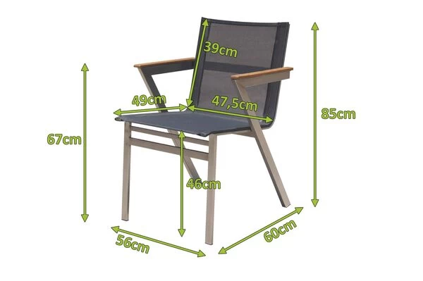 Setzen Sie einen Glanzpunkt auf Ihrer Terrasse: die designstarken Armlehnen sorgen nicht nur für Komfort, sondern sind wahre Hingucker. Der Sessel ist mit Maßen von ca. 60 x 56 x 85 cm mit bis zu ca. 150 kg belastbar und bietet Ihnen mit seiner Sitzbreite von ca. 47,5 cm und einer Sitztiefe von ca. 49 cm auch eine großzügige Sitzfläche, die jederzeit zum Verweilen einlädt. Das Gestell besteht aus gebürstetem Edelstahl der Güteklasse 304 im natürlichen Silberton, während die hautschmeichelnden Armlehnen – aus natürlichem Teakholz – dem Sessel sein außergewöhnliches Design verleihen. Im Zusammenspiel mit dem modern und puristisch gestalteten Gestell sorgt die Materialkombination für einen harmonischen Kontrast, der dem Stapelsessel Exklusivität und ein stilvolles Aussehen verleiht, das in jedem Gartendesign zum Highlight wird. Bespannt wird das solide Gestell mit Textilene (30% Polyester und 70% Vinyl) im passenden Schwarzton. Das Material ist unglaublich hautsympathisch und sorgt für ein herrlich luftiges Sitzgefühl, das Sie auch in der Sommerhitze nicht im Stich lässt. Dank des schlanken Designs und geringen Gewichtes von ca. 7,37 kg lässt sich der Sessel auch leicht transportieren, stapeln und platzsparend verstauen.