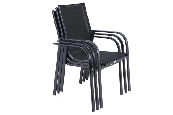 Die Sitzfläche und Rückenlehne sind mit dem Material Textilene in der Farbe schwarz bespannt. Das Kunststoffgewebe zeichnet sich vor allem durch seine hohe Belastbarkeit und seinen hohen Komfort aus. Zudem ist es frost- und hitzebeständig, was zusammen mit der hohen Lichtbeständigkeit für eine lange Attraktivität Ihrer Sitzmöbel sorgt. Auch nimmt Textilene kaum Feuchtigkeit auf, so dass die Sitzfläche nach einem Regenschauer schnell wieder trocken ist. Zum Schutz der Böden vor unschönen Kratzern beim Verrücken, besitzt der Stapelstuhl zudem Fußkappen in der Farbe schwarz.
