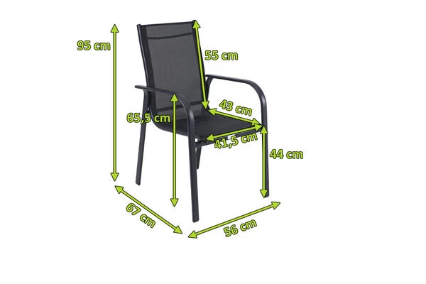 Dieser Stapelstuhl verfügt über ein pulverbeschichtetes Aluminiumgestell, welches die exklusive Farbe OUTFLEXX® anthrazit matt trägt. Aluminium ist ein gern und oft verwendetes Material beim Bau von Gartenmöbeln, da es eine hohe Stabilität und Langlebigkeit aufweist. Zudem ist es ein leichtes Material, besitzt eine gute Korrosionsbeständigkeit und ist witterungsbeständig. Die Pulverbeschichtung verbessert zusätzlich die Stoß-, Schlag- und Kratzfestigkeit des Materials und verleiht dem Aluminium einen dauerhaften Korrosionsschutz und eine anhaltende Korrosionsbeständigkeit. Der Stuhl hat ein Gesamtmaß von ca. 67 x 56 x 95 cm und ein Gewicht von ca. 2,8 kg, wodurch sich das Leichtgewicht ohne größere Anstrengungen an einen anderen Platz transportieren lässt. Bei Nichtgebrauch kann der Stuhl mit modellgleichen Stühlen gestapelt und platzsparend verstaut werden. Mit einer Belastbarkeit von bis zu ca. 160 kg ist der stabile Sessel robust und für erholsame Stunden in der Sonne einsatzbereit.