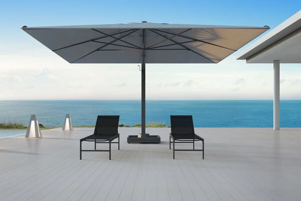 Der Ultimate XL Ampelschirm bietet Ihnen einige Vorteile und praktische Funktionen. Zum einen besitzt der Schirm keinen Mittelmast und bietet daher eine praktische Lösung, um ohne Probleme eine komplette Sitzgruppe zu beschatten. Die großzügige Durchgangshöhe von ca. 255 cm schränkt die Nutzung Ihrer Terrasse in keinster Weise ein. Dazu spendet der Sonnenschutz mit einem hohen UV-Schutz von 80+ extra viel Schatten.