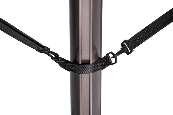 Die Windsicherung für Ampelschirme besteht aus mehreren Polyesterbändern, mit denen Sie die Bewegung Ihres Ampelschirms durch Wind stabilisieren können. Durch die Windsicherung wird zudem die Belastung auf das Schirmgestell Ihres Ampelschirms reduziert. Sie kann auch für weitere Ampelschirme genutzt werden, die eine Feststellschraube am unteren Mast haben. Bitte beachten Sie jedoch, dass Sie durch die Windsicherung keine Erhöhung der Standsicherheit Ihres Schirms erreichen. Die Abspannbänder haben eine Länge von ca. 140 – 270 cm, die Sicherung ist geeignet für Masten mit max. ca. 5,7 x 9,3 cm / Streben mit max. ca. 3 x 2 cm
