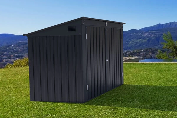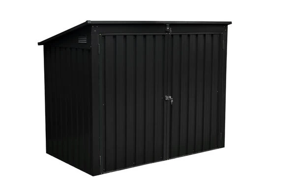 Zudem sind im Lieferumfang der Box bereits zwei Zylinderschlösser enthalten, welche zum Verschluss der Doppelschwingtür und des aufklappbaren Daches dienen. Die Grundfläche der Box beträgt ca. 1,57 m² und hat insgesamt 2 Lüftungsgitter, was die Luftzirkulation in der Box ermöglicht. Die Wände und das Dach der Box tragen die Farbe anthrazit. Durch die gedeckte Farbe fügt sich die Box dezent in seine Umgebung ein.