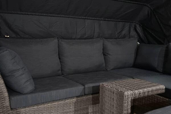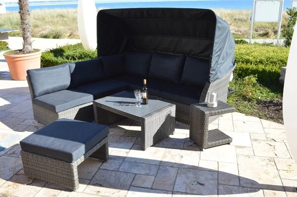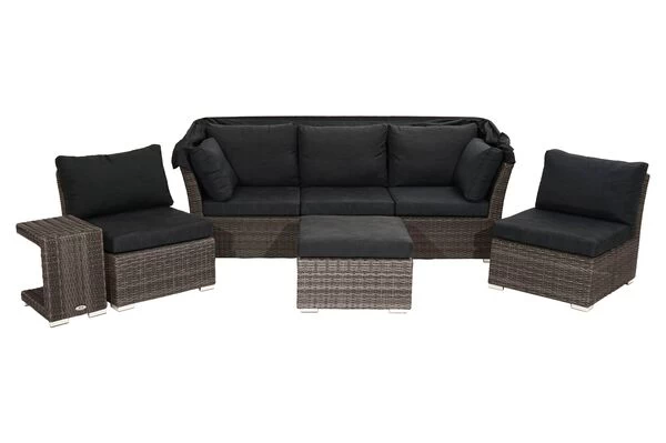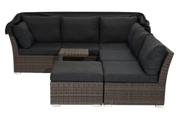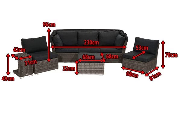 Diese gemütliche Loungegruppe bietet bequem bis zu sechs Personen Platz. Hier können Sie gemütlich in der Sonne liegen oder aber auch ganz bequem einen kleinen Snack servieren. Das Set besteht aus einem 3-Sitzer Sofa mit Maßen von ca. 230 x 81 x 85 cm, zwei Mittelelementen (ca. 68 x 81 x 70 cm), einem Hocker (ca. 68 x 68 x 32 cm) und einem praktischen Beistelltisch von ca. 31 x 42 x 49 cm. Die Lounge ist ein wahrer Verwandlungskünstler: Ob als Einzelteile gestellt, zur Ecklounge oder sogar als Loungebett – hier sind Ihrer Fantasie keine Grenzen gesetzt. Der Beistelltisch lässt sich sogar über die Sitzflächen drüber schieben, so haben Sie eine integrierte Ablagefläche. Das Highlight dieser gemütlichen Sitzgruppe ist das im 3-Sitzer Sofa integrierte Sonnendach, welches ganz leicht hochgeklappt werden kann. So haben Sie Ihren Sonnenschutz bereits fest verbaut. Und für die Sonnenanbeter – das Dach lässt sich natürlich auch zurück klappen, so können Sie ganz entspannt in der Sonne liegen.