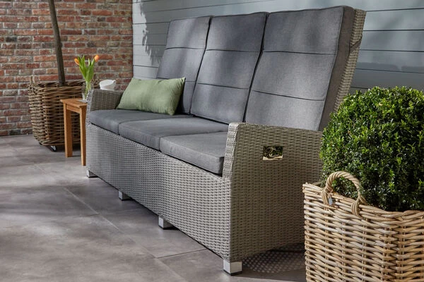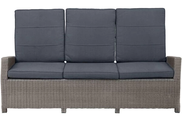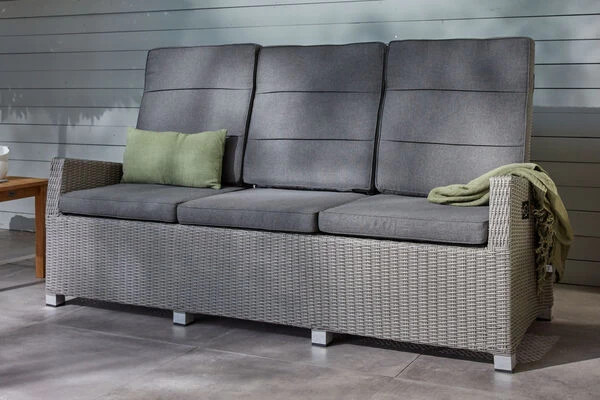 Das Untergestell besteht aus pulverbeschichtetem Aluminium, dies macht es nicht nur stabil, sondern sorgt auch dafür, dass sich das Sofa aufgrund des relativ geringen Gewichts ganz leicht hin und her stellen lässt. Das Aluminiumgestell wird mit Polyrattangeflecht bespannt. Das halbrunde Geflecht ist in der Farbe stahlgrau-meliert gehalten und integriert sich so wunderbar in alle möglichen Terrasseneinrichtungen. Gemütliche Sitz- und Rückenpolster (100 % Polyester (220 g/m³)) sorgen für höchsten Sitzkomfort. Farblich sind die schiefergraufarbenen Polster mit Quernähten perfekt auf das Geflecht abgestimmt.