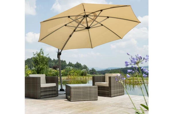 Sandfarbener Ampelschirm Rhodos Rondo für großartigen Sonnenschutz