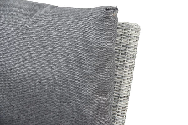 | Stabiles Polyrattan-Geflecht Das halbrunde Polyrattan-Geflecht GARDINO® in der Farbe ice grey zeichnet sich besonders durch seine Lichtechtheit und Stabilität aus. Es ist zudem besonders wasserabweisend und wetterfest. Das robuste Material schützt das Möbelstück somit bestens vor Witterungseinflüssen. |