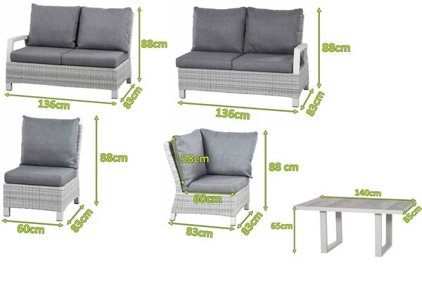 Die schicken 2-Sitzer mit einem Gesamtmaß von jeweils ca. 83 x 136 x 88 cm sind die idealen Begleiter und laden Sie jederzeit zum Verweilen ein. Die ca. 128 cm breite Sitzfläche bietet genügend Platz für je 2 Personen. Mit einer großzügigen Sitztiefe von ca. 63,5 cm und bei einer Sitzhöhe von ca. 36 cm ohne Kissen lässt es sich herrlich entspannen, allein oder mit Ihren Liebsten. Die praktischen Armlehnen bieten zusätzlichen Komfort und sind zudem ein echter Hingucker. Das Mittemodul ist ca. 60 x 83 x 88 cm groß und das Eckmodul hat Maße von ca. 83 x 83 x 88 cm und sie sind perfekt zum Füße hochlegen oder zum Vergrößern der Sitz- oder Liegefläche. Passende, extra starke Kissen in der Trendfarbe „stone grey“ verleihen den Sitzmöbeln ein unvergleichliches Sitzerlebnis. Der Loungetisch hat eine Größe von ca. 140 x 85 cm und eine Unterschubhöhe von ca. 61,5 cm. Der Tisch wird mit einer modernen Keramik-Tischplatte in der Farbe „washed grey“ geliefert. Sie verleiht ihm einen edlen Charakter und natürlichen Look. Die Tischplatte ist robust, pflegeleicht und dazu noch wetterfest – so steht einem leckeren Brunch mit Freunden und Familie nichts im Wege.