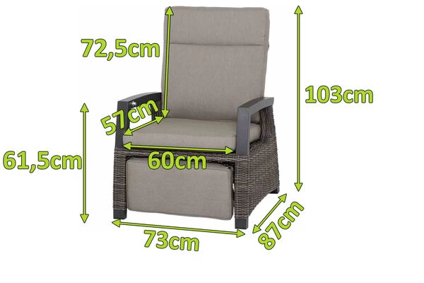 Der hochwertige Relaxsessel ist der Inbegriff von Komfort und Bequemlichkeit in elegantem Design. Egal ob Sie die Sonne genießen, ein gutes Buch lesen oder gemütlich mit Ihren Lieben Abendessen möchten. Dieser bequeme Sessel ist der ideale Begleiter und ein wahrer Anpassungskünstler. Sie entscheiden selbst, ob Sie die Sessel- oder die Liegefunktion benutzen möchten. Dank der einfachen, intuitiv und besonders leichtgängigen, stufenlosen Verstellung der Rückenlehne per Knopfdruck erhalten Sie im Handumdrehen eine Liegeposition. Sie werden von dem fühlbaren Sitz- und Liegekomfort begeistert sein. Der Fußteil verstellt sich direkt mit, so dass Sie nichts weiter tun müssen, als sich entspannt zurückzulehnen und die Beine gemütlich hochzulegen. Der Sessel hat ein Gesamtmaß von ca. 73 x 87 x 103 cm. Die ca. 60 cm breite Sitz- und Liegefläche bietet genügend Platz. Mit einer großzügigen Sitztiefe von ca. 57 cm und bei einer Sitzhöhe von ca. 38 cm lässt es sich hier auch herrlich bei einem Nickerchen entschleunigen. Die praktischen Armlehnen aus Aluminium sind echte Hingucker und bieten zusätzlichen Komfort. Passende Polster in der Trendfarbe taupe meliert verleihen dem Sitzmöbel ein unvergleichliches Sitzerlebnis.