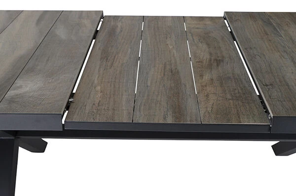 Wer das Besondere liebt und gerne auf jede Gelegenheit vorbereitet sein möchte, ist mit einem Ausziehbaren Esstisch bestens bedient. Der Tisch ist ca. 103 cm breit und ca. 77 cm hoch, im normalen Zustand hat er eine Länge von ca. 205 cm – so steht dem gemütlichen Mittagessen mit der Familie nichts mehr im Wege. Das Gestell wurde aus pulverbeschichtetem Aluminium in Anthrazit hergestellt, was den Tisch besonders haltbar macht. Die Tischplatte besteht aus hochwertigem Keramik in naturgrauer Holzoptik. Die Platte zum Erweitern des Tisches ist ebenfalls aus ca. Keramik gefertigt und lässt sich ganz einfach ausziehen. Man zieht einfach die beiden oberen Platten auseinander und zieht die darunterliegende Platte nach oben, und schon ist der Tisch auf ca. 265 cm erweitert – perfekt für spontane, große Runden. Die Unterschubhöhe beträgt ca. 68 cm – so kann man gemütlich mit vielen Arten von Sesseln an diesem Tisch Platz nehmen. Der Tisch hat ein Gewicht von ca. 93,5 kg, und ist somit perfekt gegen Windstöße geschützt. Die Fußkappen bestehen aus schwarzem Kunststoff und schützen den Boden vor unschönen Kratzern beim Verrücken des Möbelstücks.