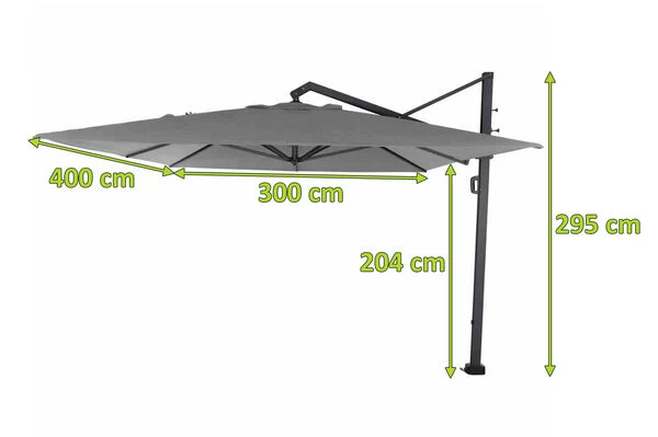 Mit dem Ampelschirm aus der Stratos Serie von Siena Garden können Sie dank der Maße von ca. 300 x 400 cm eine große Fläche abdecken – perfekt für gemütliche Tage im Freien mit der ganzen Familie. Das Schirmtuch passt sich auch optisch perfekt an Ihre Terrasse an. Dank der Gesamthöhe von ca. 295 cm kann man unter dem Schirm auch bequem stehen, zum Beispiel am Stehtisch bei der nächsten Gartenparty. Der ca. 78 x 78 mm dicke, ovale Schirmstock wird aus hochwertigem Aluminium produziert, welches einem Pulverbeschichtungsverfahren unterzogen wurde, und so äußerst robust ist. Besonders praktisch: Durch das verwendete Aluminium wiegt der Schirm nur ca. 33 kg und lässt sich trotz seiner Größe noch einfach hin und her transportieren. Die 8 Schirmstreben sind ebenfalls aus Aluminium gefertigt und sorgen für die nötige Stabilität.