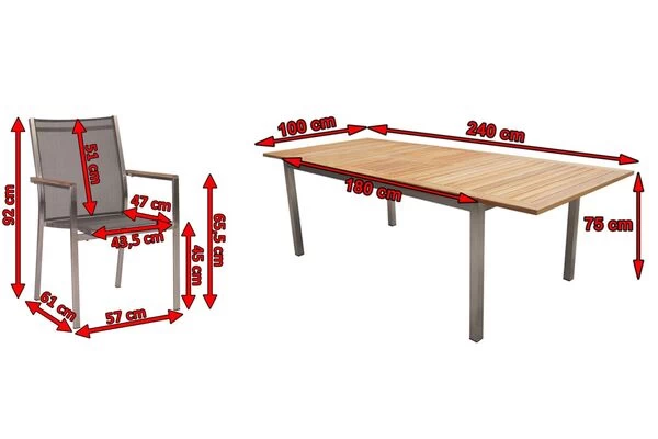 Bei dieser Esstischgruppe treffen besonders edle Materialien und zeitloses Design aufeinander. Das Set besteht aus einem Ausziehtisch der Marke OUTFLEXX mit den Maßen von ca. 180/240 x 100 x 75 cm und 6 Stapelsesseln der Marke Stern aus der Serie „Cardiff“. Die hellen Farben des Gestells sind in Verbindung mit der Farbe des Teakholzes ein echter Hingucker und sorgen für eine zeitlose Frische. Dadurch lässt sich die Esstischgruppe wunderbar mit anderen Farben kombinieren. So bleibt Ihnen viel Raum für kreative Gestaltungsmöglichkeiten. Die hochwertigen Materialien und die sorgfältige Verarbeitung sorgen nicht nur für die besondere Optik dieser Esstischgruppe, sondern machen sie auch sehr stabil.