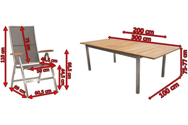 Bei dieser Esstischgruppe treffen besonders edle Materialien und zeitloses Design aufeinander. Das Set besteht aus einem Ausziehtisch der Marke OUTFLEXX mit den Maßen von ca. 200/300 x 100 x 75-77 cm und 6 Multipositionssesseln der Marke Stern aus der Serie „Cardiff“. Die hellen Farben des Gestells sind in Verbindung mit der Farbe des Teakholzes ein echter Hingucker und sorgen für eine zeitlose Frische. Dadurch lässt sich die Esstischgruppe wunderbar mit anderen Farben kombinieren. So bleibt Ihnen viel Raum für kreative Gestaltungsmöglichkeiten. Die hochwertigen Materialien und die sorgfältige Verarbeitung sorgen nicht nur für die besondere Optik dieser Esstischgruppe, sondern machen sie auch sehr stabil.