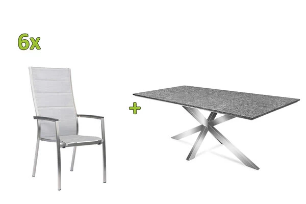 Hier fühlt sich jeder Gast sofort willkommen! Verwandeln Sie mit dieser tollen Tischgruppe Ihre Terrasse in einen charmanten Wohnbereich im heimischen Garten. Sie erhalten einen ausdrucksstarken Esstisch aus Edelstahl und Granit und 6 dazu passende Stapelsessel der Serie Cardiff von STERN, die für einen gehobenen Sitzgenuss sorgen. Gönnen Sie sich Ihren persönlichen Essplatz im Freien.