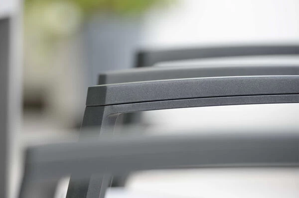 Die hochwertigen Materialien verleihen den Möbeln nicht nur Witterungsbeständigkeit, sondern auch Pflegeleichtigkeit. Die Pulverbeschichtung des Tischgestells macht ihn zudem besonders stoß-, schlag- und kratzfest. Das verwendete Sicherheitsglas verfügt über eine hohe Temperaturwechselbeständigkeit, sodass warme Speisen auch direkt auf der Tischplatte abgestellt werden können. Sollte es trotz erhöhter Schlag- und Biegefestigkeit doch einmal zu einem Bruch kommen, zerfällt das Glas in eine Vielzahl stumpfkantiger, kleiner Scherben mit wesentlich verminderter Verletzungsgefahr. Die schnelltrocknende Textilenbespannung der Sessel ist UV-beständig, reißfest und verliert nie ihre Form. Aufgrund der pflegeleichten Eigenschaften der Materialien lassen sich oberflächliche Verschmutzungen auch direkt mit etwas Wasser entfernen. Fußkappen, die Ihre Terrasse vor unschönen Kratzern schützen, dürfen natürlich auch nicht fehlen. Erfreuen Sie sich über viele Jahre an diesem Set.