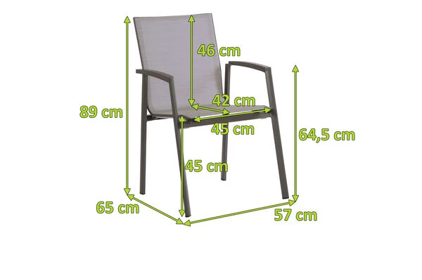 Der Sessel überzeugt nicht nur mit seinem zeitlosen Design und den hochwertigen Materialien, sondern vor allem auch durch seinen Komfort und seine Funktionalität. Schlicht, unauffällig und dennoch ein Hingucker. So lässt sich der New Top wohl am besten beschreiben. Holen Sie sich mit diesem Sessel Eleganz vereint mit perfektem Sitzkomfort nach Hause und genießen Sie entspannte Stunden z.B. nach Ihrem Feierabend. Die hochwertigen Materialien und die sorgfältige Verarbeitung sorgen nicht nur für die besondere Optik dieses Stuhls, sondern machen ihn auch äußerst stabil. Der New Top wird Ihnen durch seine hohe Widerstandsfähigkeit gegen Wind und Wetter viele Jahre Freude bereiten. Das Gestell aus Aluminium ebenso wie das Textilgewebe der Sitzfläche und der Rückenlehne sind besonders pflegeleicht. Die Sitzfläche hat die Farbe silber. Leichte Verschmutzungen lassen sich ganz einfach mit ein wenig Wasser wieder entfernen. Durch seine Stapelfunktion und den Maßen von ca. 65 x 57 x 89 cm lässt sich der Stuhl aber dennoch platzsparend verstauen, wenn Sie doch einmal etwas mehr Platz auf Ihrer Terrasse oder im Garten benötigen sollten.