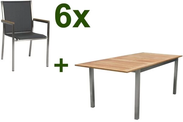 STERN Polaris Esstischgruppe, silbergrau, OUTFLEXX Ausziehtisch, FSC-Teak/Edelstahl, 6 Stapelsessel