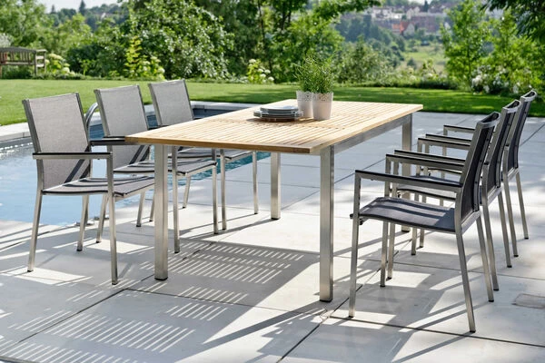 Kombinieren Sie zu diesem Stuhl doch gleich auch den passenden Gartentisch. Passende Tische finden Sie unterhalb der „Warenkorb“-Schaltfläche im Abschnitt Zubehör.