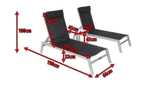 Dieses schicke und zeitlose Gartenliegenset von Villana bereichert jeden Garten, Balkon, Spa-Bereich oder jede Terrasse. Es besteht aus zwei Gartenliegen und einen praktischen Beistelltisch. Die Liegen sind mehrfach verstellbar, sodass man für sein Wohlgefühl die richtige Einstellung wählen kann. Jede Liege verfügt über ein hochwertiges, silberfarben pulverbeschichtetes Aluminiumgestell, auf welches ein formstabiles Textil-Gewebe 2×1 (70% Polyvinylchlorid / 30% Polyester) in Schwarz aufgespannt wurde. Die maximale Belastbarkeit der Liegen liegt bei je ca. 160 kg. Der Beistelltisch (ca. 45 x 45 cm) bietet die perfekte Ergänzung zu den Liegen, zum Beispiel als Ablage für die Zeitung oder ein gutes Buch, die Sonnen- oder Lesebrille oder etwas Leckeres zwischendurch. Das Gestell des Tisches ist ebenfalls aus pulverbeschichtetem Aluminium in Silber gefertigt, die ca. 5 mm dicke Tischplatte aus Sicherheitsglas ist weiß. Die Fußkappen der Möbel sind aus silbernem Kunststoff und schützen den Boden vor unschönen Kratzern beim Verrücken des Stuhles, die silbernen Schrauben aus galvanisiertem Stahl runden die Optik perfekt ab. Mit einem Gewicht von nur ca. 8,1 kg und Maßen von ca. 198 x 66 x 32 cm fügen sich die Liegen perfekt in Ihren Garten ein und lassen sich zusätzlich auch leicht hin und her stellen. Jetzt noch ein gutes Buch dazu und schon wird jede Minute in Ihrem Garten zur puren Entspannung.