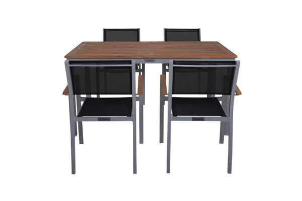 Das Akazienholz für die Tischplatte und die Armlehnen ist FSC-zertifiziert. Die FSC-Zertifizierung garantiert Ihnen, dass dieses Möbelstück aus verantwortungsvollen Quellen stammt, sodass Sie sich guten Gewissens zurücklehnen und Ihre neue Esstischgarnitur so richtig genießen können. Akazienholz zeichnet sich zudem durch seine extrem gute Witterungsbeständigkeit aus und besitzt eine besonders hohe Härte und Festigkeit – selbst Eichenholz kann da nicht mehr mithalten.