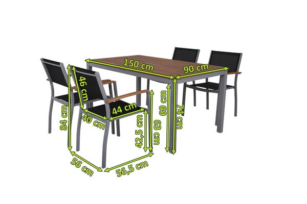 Diese Villana Esstischgruppe bietet genügend Platz für vier Personen und besitzt auch in Sachen Komfort und Verarbeitung nur die beste Qualität. Die Farb- und Materialkombination aus Silber, Schwarz, Aluminium, Textilene und FSC-Akazienholz sorgt für eine rustikale Eleganz, welche die vielfältige Kombination mit anderen Möbelstücken oder Dekoration ermöglicht. Der Gartentisch von Villana bietet Ihnen mit einer Länge von ca. 150 cm und einer Breite von ca. 90 cm genügend Platz, um reichlich bestückt zu werden. Mit seiner Höhe von ca. 74 cm besitzt dieser Tisch eine ideale Wohlfühlhöhe. Der Tisch wiegt ca. 17 kg und die Tischplatte weist neben einem neuen Design, eine verbesserte Stabilität auf. Die Tischplatte ist ca. 20 mm dick. Das hochwertige Aluminiumgestell wurde sowohl bei dem Esstisch als auch bei den Stühlen pulverbeschichtet und kommt in einem eleganten Silber daher. Die Pulverbeschichtung sorgt für längere Haltbarkeit und Witterungsbeständigkeit.